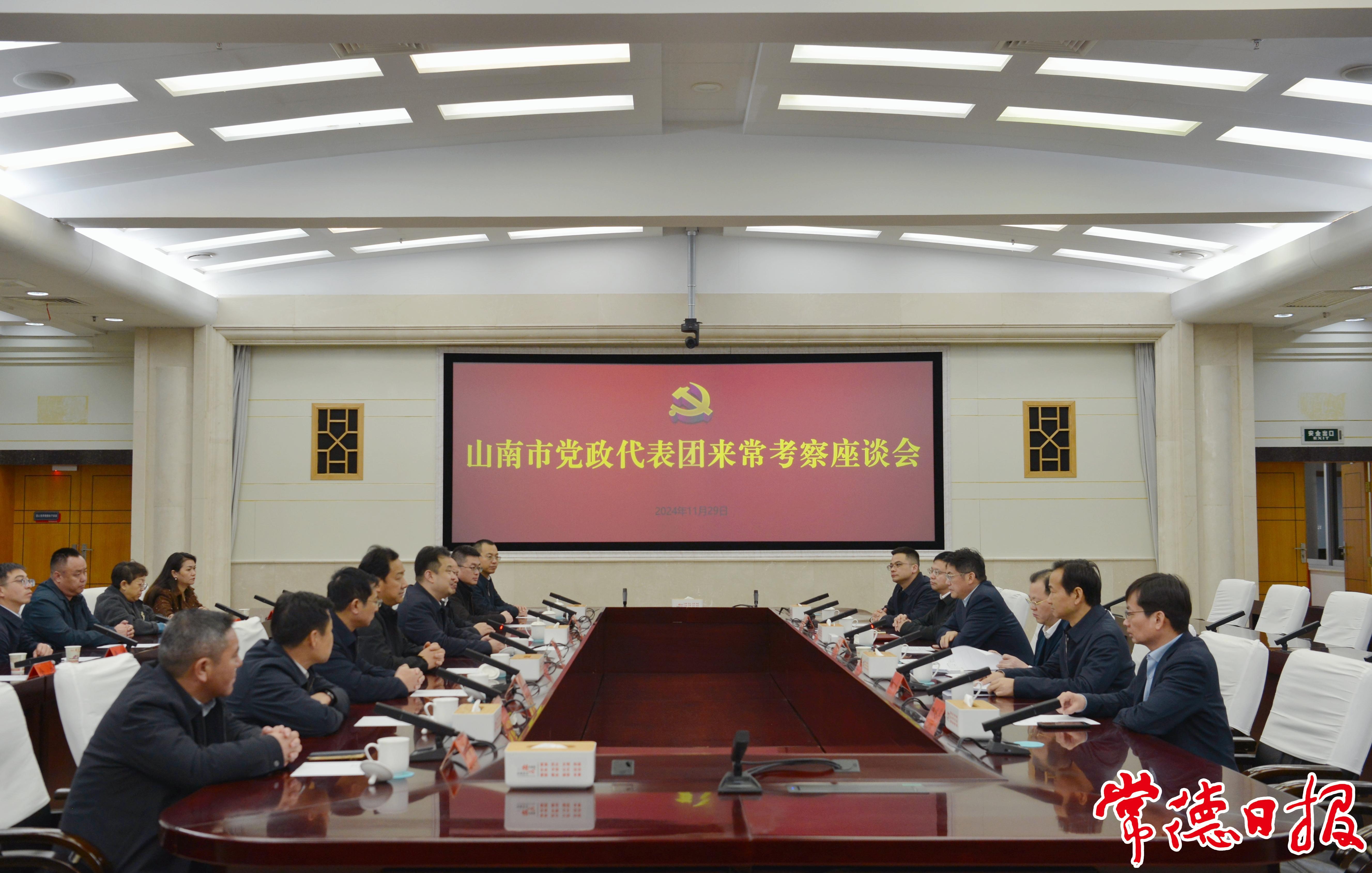 常德日?qǐng)?bào)記者 羅希 文/圖 11月29日,西藏自治區(qū)山南市黨政代表團(tuán)一行來??疾臁J形瘯浟_毅君與代表團(tuán)一行進(jìn)行座談交流。市委副書記、市長周振宇出席座談會(huì)。