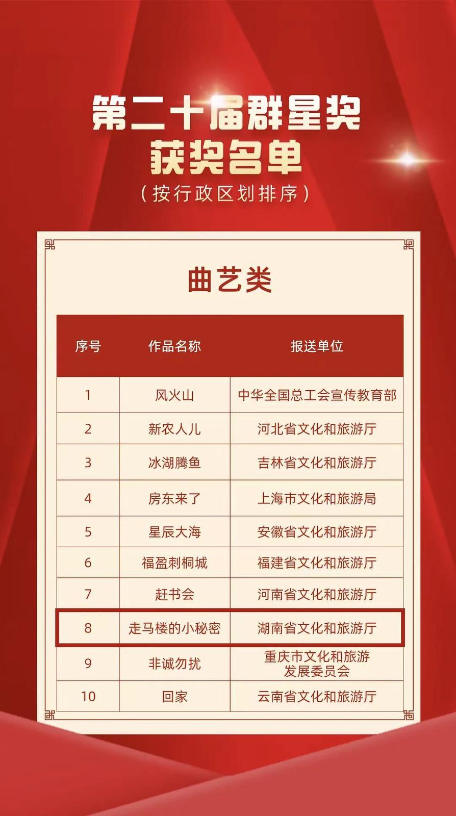 常德日報記者 裴維維 通訊員 孫寧思 童盈旗 11月4日,重慶群星劇院燈火璀璨,“大地情深”——全國優(yōu)秀群眾文藝作品展演暨第二十屆群星獎頒獎活動隆重舉行。萬眾矚目下,第二十屆群星獎獲獎名單正式揭曉,常德絲弦《走馬樓的小秘密》成功斬獲曲藝類群星獎這一國家級群眾文藝最高榮譽,這也是常德時隔12年后再次摘得該類獎項。